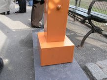 InstallationOn January 3, 2005, work began on the installation of the project. During the week of January 17th, the park was filled with workers using fork lift vehicles to move the rectangular metal plates into position all over central park. There were small signs placed on every walkway in the park with alphanumeric codes which the workers were using to place the metal places onto the designated spots. As of January 27, most of the rectangular metal plates had been placed in their positions. Many had small orange plastic markers sticking up a foot or two (around half of meter) from each end, possibly intended to help people find the base plates if they were covered with snow. The snow (there was a major snow storm on January 22nd) and extreme cold hampered progress in late January. As of February 7, there were many teams of workers wearing silver grey smocks moving the vertical parts of the gates, and attaching them to the base plates. The documentation describes the color as "saffron" but local observers would describe it as orange. Here is the hardware being used to make the vertical pieces parallel, even when the base plates are not parallel (due to uneven or sloping ground). When attached, the vertical pieces are about 6 meters high, with a cross bar at the top from which the flag piece will be unfurled. The most common width seems to be 11 feet (3.35 meters) although they vary considerably (depending on the width of the path) from around 6 feet (2 meters) to over 20 feet (6 meters)