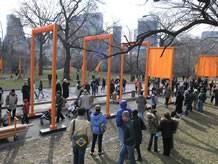 OpeningThe project was officially launched on February 12, 2005, when New York Mayor Michael Bloomberg dropped the first piece of fabric at 8:30 AM, with Christo and Jean Claude in attendance. The rest of The Gates were opened over the course of the next few hours, with large crowds of people watching. Generally, the crews of people who erected the gates were assigned to open them. They simply had to walk underneath, and use a hook at the end of a long stick to pull a loop hanging from the cross bar of each gate. That opened the cloth bag which contained the "flag" part of the gate. The bag fell to the ground, along with a card board tube around which the flag was rolled. The flag part then hung majestically from the cross bar. As of February 13, all of The Gates have been opened. The project staff is still deployed in the park, patrolling, and replacing a few of The Gates that have become damaged. There are many more people then usual walking around in the park, looking and photographing The Gates.
